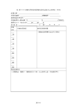 表 調 2-12-1 採樣孔開挖剖面調查坑剖面記錄(水土保持局,2010) 計畫名稱: 調查坑編號: 試驗編號: 調查範圍位置說明: 調查範圍中心點坐標:Y X (TWD97) 調查坑尺寸:寬×長×深= m× m× m 調 查 者: 日 期: 年 月 日 深度 分層組成描述 試坑柱狀剖面圖 (cm) (開挖面放置標尺或皮尺之照相) 20 40 60 80 100 120 140 160 現地記錄照片 (含開挖前、開挖中、開挖後至少 3 張,以及參與人員、當地街景等) 調-2-81
