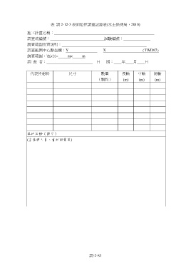 表 調 2-12-3 表面粒徑調查記錄表(水土保持局,2010) 施工計畫名稱: 調查坑編號: 試驗編號: 調查範圍位置說明: 調查範圍中心點坐標:Y X (TWD97) 調查範圍:寬×長= m× m 調 查 者: 日 期: 年 月 日 代表性材料 尺寸 數量 長軸 中軸 短軸 (顆粒) (m) (m) (m) 現地紀錄(照片) (含參與人員、當地街景等) 調-2-83