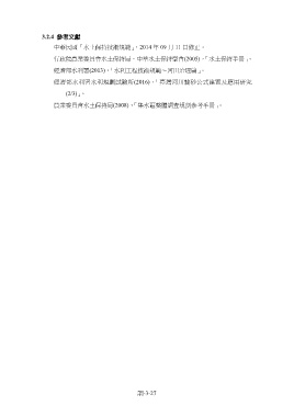 3.2.4 參考文獻 中華民國「水土保持技術規範」,2014 年 09 月 11 日修正。 行政院農業委員會水土保持局、中華水土保持學會(2005),「水土保持手冊」。 經濟部水利署(2013),「水利工程技術規範~河川治理篇」。 經濟部水利署水利規劃試驗所(2016),「臺灣河川輸砂公式建置及應用研究 (2/3)」。 農業委員會水土保持局(2008),「集水區整體調查規劃參考手冊」。 調-3-27