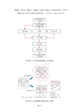 鄭錦桐、林伯勳、蕭震洋、梁惠儀、許振崑、連榮吉、林柏壽(2009),「石門水 庫集水區之土砂災害監測及評估技術」,土木水利,36(2),pp. 6-19。 圖 調 2-1-1 地形調查與測繪工作流程圖 圖 調 2-1-2 坵塊畫設及範例計算示意圖 調-2-9