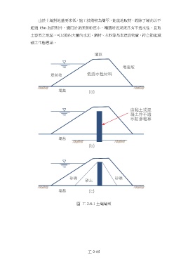 由於土壩對地基要求低,施工技術較為簡單,能就地取材,故除了壩高以不 超過 15m 為原則外,適用於溪床質粒徑小、壩基附近溪床具有不透水性,且取 土容易之地區,可以節約大量的水泥、鋼材、木料等基本建設物資,符合節能減 碳之生態意涵。 圖 工 2-8-1 土壩壩型 工-2-85