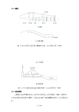 2.8.4 圖說 平面圖 L-L 斷面圖 圖 工 2-8-2 明渠式溢洪道土壩(資料來源:水土保持手冊,2005) (a) 平面圖 (b) 斷面圖 圖 工 2-8-3 垂流涵洞式溢洪(資料來源:水土保持手冊,2005) 2.8.5 設計原則 土壩設計宜按照壩址附近土石料的分布狀況(土石料的種類、儲量、運距等), 以及地基條件選定適宜的壩型,然後在此基礎上擬定壩體的剖面尺寸及其構造設 計。 工-2-86