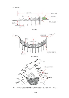 (三)樹枝壩: (a)正視圖 (b)A-A 斷面 圖 工 2-9-3 多樁縱排或樹枝壩示意圖(資料來源:水土保持手冊,2005) 工-2-94