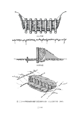 (a)正視圖 (b)側視圖 圖 工 2-9-4 單縱樁樹枝壩示意圖(資料來源:水土保持手冊,2005) 工-2-95