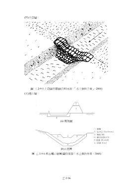 (四)土袋壩: 圖 工 2-9-5 土袋壩示意圖(資料來源:「水土保持手冊」,2005) (五)堆石壩: (a) 側視圖 (b)正視圖 圖 工 2-9-6 堆石壩示意圖(資料來源:水土保持手冊,2005) 工-2-96