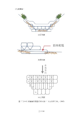 (九)蛇籠壩: (a)正視圖 (b)側視圖 (c)上視圖 圖 工 2-9-11 蛇籠壩示意圖(資料來源:「水土保持手冊」,2005) 工-2-101