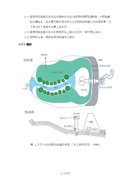 (一) 當滯洪設施蓄水池水位到達抽水水位(亦即滯洪期間起點)時,立即啟動 抽水機抽水。抽水量同樣不得大於水土保持技術規範之容許排放量,也 不得大於下游承受水體之涵容量。 (二) 當滯洪設施蓄水池水位降到原先之抽水水位時,即可停止抽水。 (三) 降雨停止後,再抽乾滯洪設施內之蓄水。 2.27.4 圖說 圖 工 2-27-4 乾式滯洪池(資料來源:「水土保持手冊」,2005) 工-2-223