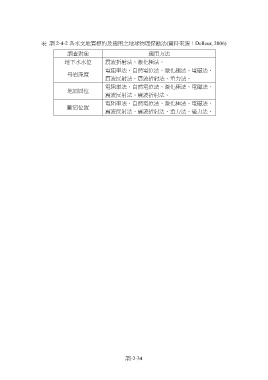 表 調 2-4-2 各水文地質標的及適用之地球物理探勘法(資料來源:Delleur, 2006) 調查對象 適用方法 地下水水位 震波折射法、激化極法。 電阻率法、自然電位法、激化極法、電磁法、 母岩深度 震波反射法、震波折射法、重力法。 電阻率法、自然電位法、激化極法、電磁法、 地層層位 震波反射法、震波折射法。 電阻率法、自然電位法、激化極法、電磁法、 斷層位置 震波反射法、震波折射法、重力法、磁力法。 調-2-34