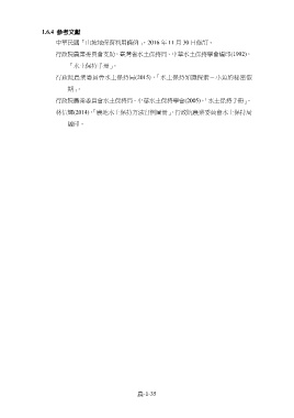 1.6.4 參考文獻 中華民國「山坡地保育利用條例」,2016 年 11 月 30 日修訂。 行政院農業委員會支助,臺灣省水土保持局、中華水土保持學會編印(1992), 「水土保持手冊」。 行政院農業委員會水土保持局(2015),「水土保持知識探索-小魚的秘密假 期」。 行政院農業委員會水土保持局、中華水土保持學會(2005),「水土保持手冊」。 林信輝(2014),「農地水土保持方法實例圖冊」,行政院農業委員會水土保持局 編印。 農-1-35