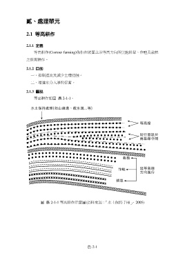 貳、處理單元 2.1 等高耕作 2.1.1 定義 等高耕作(Contour farming)係指在坡面上沿等高方向所實施耕犁、作畦及栽植 之保育耕作。 2.1.2 目的 一、抑制逕流及減少土壤侵蝕。 二、增進水分入滲與保蓄。 2.1.3 圖說 等高耕作如圖 農 2-1-1。 圖 農 2-1-1 等高耕作示意圖(資料來源:「水土保持手冊」,2005) 農-2-1