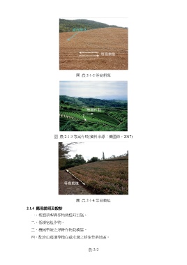 圖 農 2-1-2 等高耕犁 圖 農 2-1-3 等高作畦(資料來源:黃國鋒,2017) 圖 農 2-1-4 等高栽植 2.1.4 應用說明及設計 一、坡面耕犁與作物栽植時實施。 二、低矮密植作物。 三、機械整坡之淨耕作物栽植區。 四、配合山邊溝等橫向截水溝之耕犁作業地區。 農-2-2