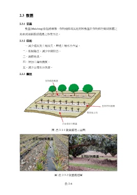 2.3 敷蓋 2.3.1 定義 敷蓋(Mulching)係指將草類、作物殘株或其他材料敷蓋在作物株行間或裸露之 地表或果樹基部週邊之作業方法。 2.3.2 目的 一、減少逕流及土壤流失,增進土壤水分含量。 二、抑制雜草,減少中耕除草。 三、調節地溫。 四、增加土壤有機質。 五、減少土壤水分蒸發。 2.3.3 圖說 圖 農 2-3-1 敷蓋處理示意圖 圖 農 2-3-2 敷蓋處理圖 農-2-6