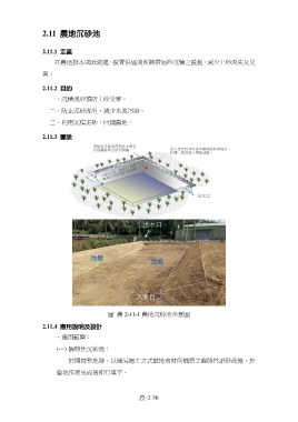 2.11 農地沉砂池 2.11.1 定義 在農地排水或匯流處,設置供逕流所挾帶泥砂沉積之設施,減少土砂流失及災 害。 2.11.2 目的 一、沉積泥砂預防土砂災害。 二、防止泥砂流出,減少水流污染。 三、利用沉積泥砂,回鋪農地。 2.11.3 圖說 圖 農 2-11-1 農地沉砂池示意圖 2.11.4 應用說明及設計 一、適用範圍: (一) 臨時性沉砂池: 於開挖整地時,以簡易施工方式就地取材所構築之臨時性淤砂設施,於 整地作業完成後即行填平。 農-2-36