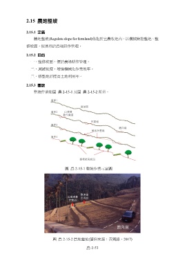 2.15 農地整坡 2.15.1 定義 農地整坡(Regulate slope for farmland)係指於宜農牧地內,以機械開挖整地、整 修坡面,使其利於農場耕作管理。 2.15.2 目的 一、整修坡面,便於農場耕作管理。 二、減緩坡度,增進機械化作業效率。 三、修整地形提高土地利用率。 2.15.3 圖說 整坡作業如圖 農 2-15-1 及圖 農 2-15-2 所示。 圖 農 2-15-1 整坡作業示意圖 圖 農 2-15-2 農地整坡(資料來源:黃國鋒,2017) 農-2-53