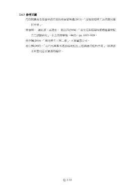 2.6.3 參考文獻 行政院農業委員會林務局南投林區管理處(2015),「崩塌地噴植工法與應用基 材手冊」。 林信輝、 謝政諺、巫清志、 陳意昌(2014),「含水泥與菇類堆肥噴植資材配 方之試驗研究」,水土保持學報,46(2),pp. 1015-1028。 林信輝(2016),「坡地植生工程二版」,五南圖書公司。 林信輝(2007),「石門水庫集水區崩塌地植生工程與應用植物手冊」,經濟部 水利署北區水資源局編印。 植-2-22