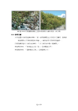 圖 植 4-4-6 打樁編柵(柳枝工)謢岸案例照片(資料來源:林信輝) 4.4.4 參考文獻 日本全國治水砂防協會(1998),「新‧斜面崩壞防止工事設計之實例–急傾斜 地崩壞防止工事技術指針(本編) 」,建設省河川局砂防部監修。 行政院農委會水土保持局(2007) ,「水土保持局生態工程種類」。 林信輝(2016) ,「坡地植生工程二版」,五南圖書公司。 林信輝(2016) ,「圖解植生工程」,五南圖書公司。 植-4-29
